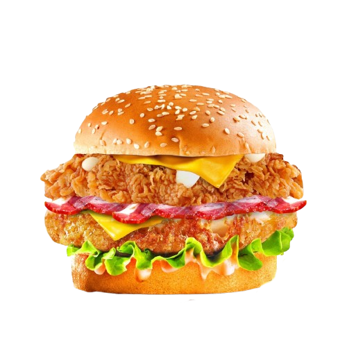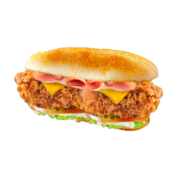 2 filets tenders, salade,tomate,oignon, cheddar,sauce spécial jambon fumé