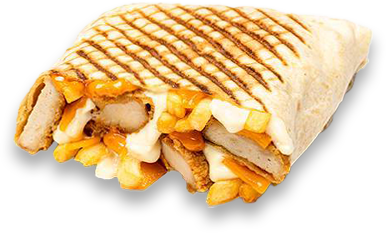 4 filets tenders, salade,tomate,oignon, galette de blé toastée, Galette de pomme de terre, cheddar, sauce