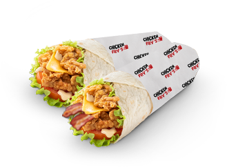 4 filets tenders, bacon, salade,tomate,oignon, galette de blé toastée, Galette de pomme de terre, cheddar, sauce
