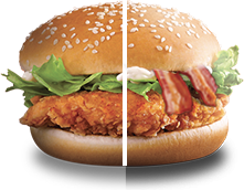 2 filets tenders, bacon, salade,tomate,oignon, cheddar, sauce barbecue